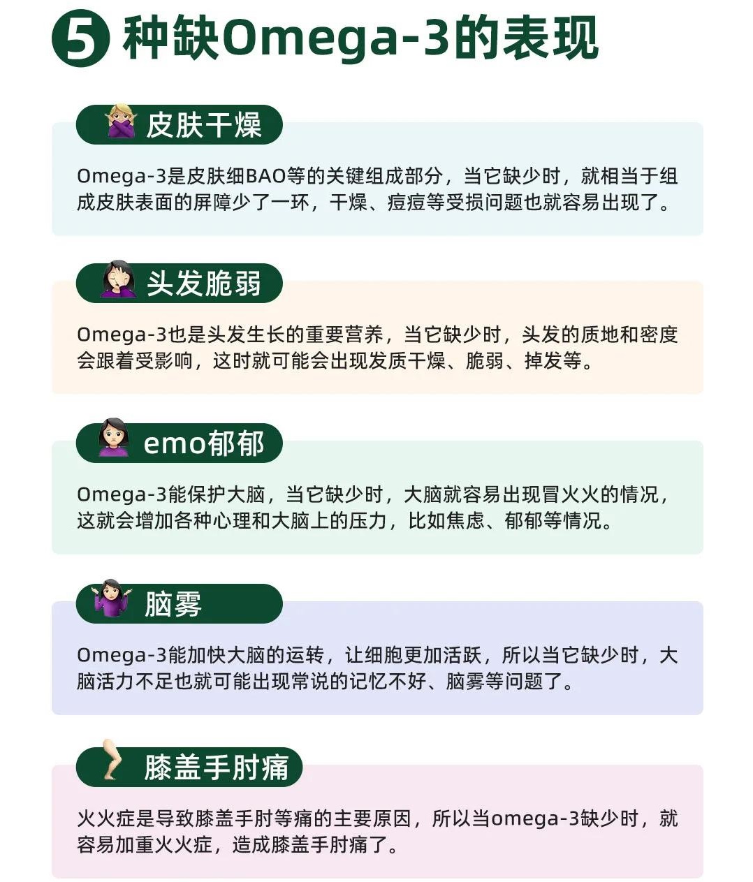 4. 情绪波动:莫名焦虑或情绪低落?Omega - 3 可调节 5 - 羟色胺水平,研究表明其补充剂可使抑郁症状评分降低 25%。